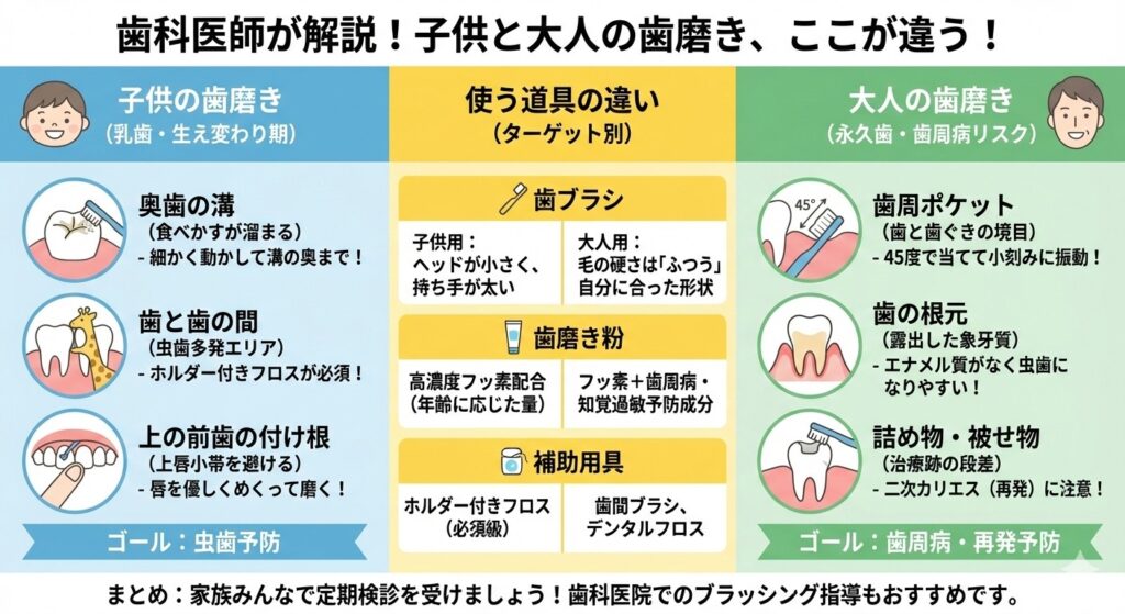 【子供と大人の歯磨きの違い】年齢別に注意すべき磨き残しポイントとは?