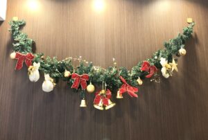 エントランスのツリーや受付けのガーランドはみんなで飾り付けをしました。